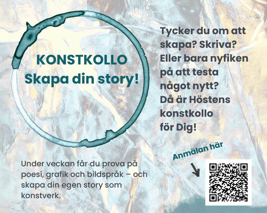 Tycker du om att skapa? Skriva? Eller bara nyfiken på att testa något nytt? Då är Höstens konstkollo för Dig! Inga förkunskaper krävs. Ansökan öppnar 22 september. Begränsat antal platser!
