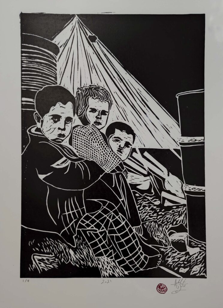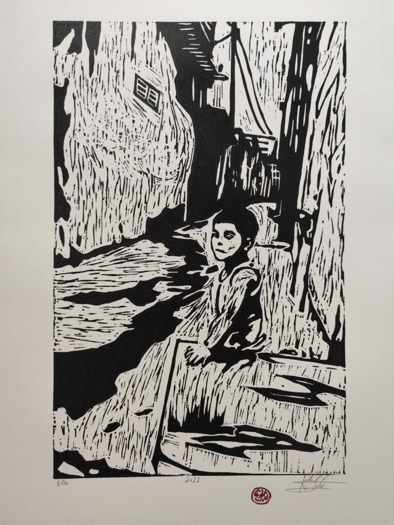 Founded in 2010, Pangrok Sulap is a Malaysian collective of artists, musicians, and social activists with a mission to empower rural marginalized communities through art. “Pangrok” is the local pronunciation of “punk rock,” and “Sulap” is a hut or a resting place usually used by farmers in Sabah, Borneo. Since 2013, woodcut prints have become the Collective’s main tool to spread social messages, through large-scale exhibition works as well as handmade merchandise. A strong element of Pangrok Sulap’s process is community participation. The Collective collaborates with community members to collect indigenous narratives and experiences to spread awareness through their artworks.