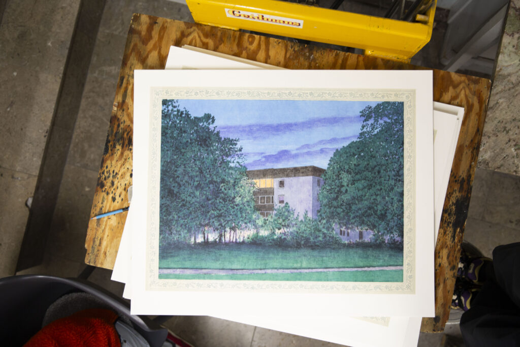 – Själva motivet kom till mig på en barnvagnspromenad i trakten där min familj och jag bor. Så det är baserat på en verklig plats, men jag har tagit mig en hel del friheter att bearbeta motivet och ändrat tiden på dygnet. När jag gjorde den här bilden hade jag flera av mina äldre verk i tankarna. Jag gjorde även en oljemålning, som en skiss som jag utgick ifrån. Jag ville försöka få till kvällsljuset i himlen och kontrasten mellan den och marken, med dess skiftande mörka toner i den litografiska tekniken.