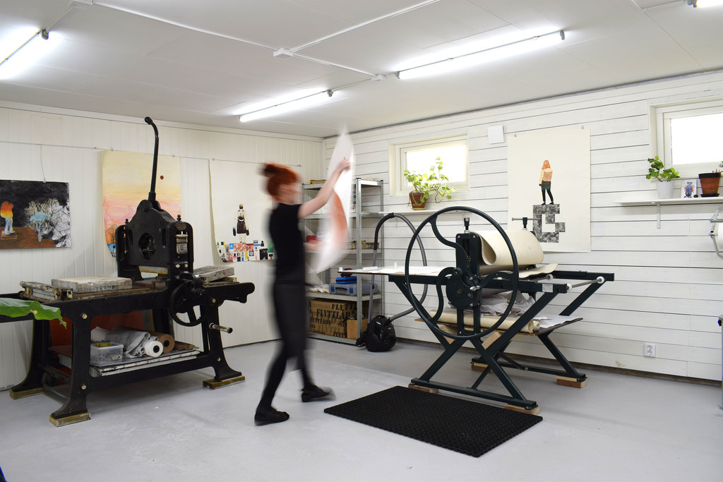 Jag gillar att kombinera olika tekniker med varandra. Jag arbetar med litografi, screen, torrnål, etsning och fotopolymer. Ibland går jag även in med måleri och teckning.